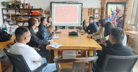 控制系主任张承维、机械系教师邱明权、吴震宇与美术学院民族民间美术系教师王丽娜、陈向向围绕等民间艺术作品如何与科技结合、跨学科人才培养等方面进行了深入的探讨和交流。