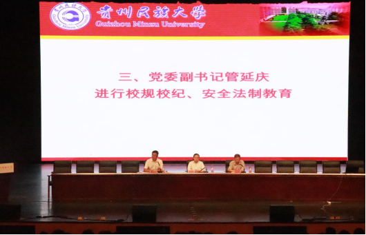 接着,党委副书记管延庆对全体新生进行校规校纪、安全法制教育。管延庆书记详细的向同学们介绍民大的校纪校规,并着重强调全体新生在学习生活中,要把校纪校规牢记于心,确保安全愉快的度过大学四年的生活。