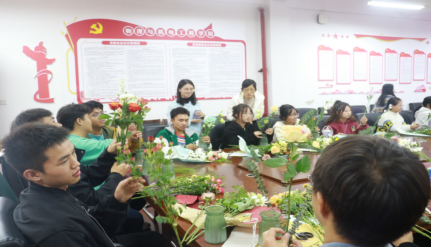 活动期间,学院还举办了插花艺术培训。吴胜婷同学作为主讲人为同学们介绍了插花的文化背景、审美特点及插花的方法技巧。随后,同学们用剪刀对花束进行修剪,在老师的悉心指导下,完成自己的插花作品,参与活动的同学们都收获了自己满意的作品。