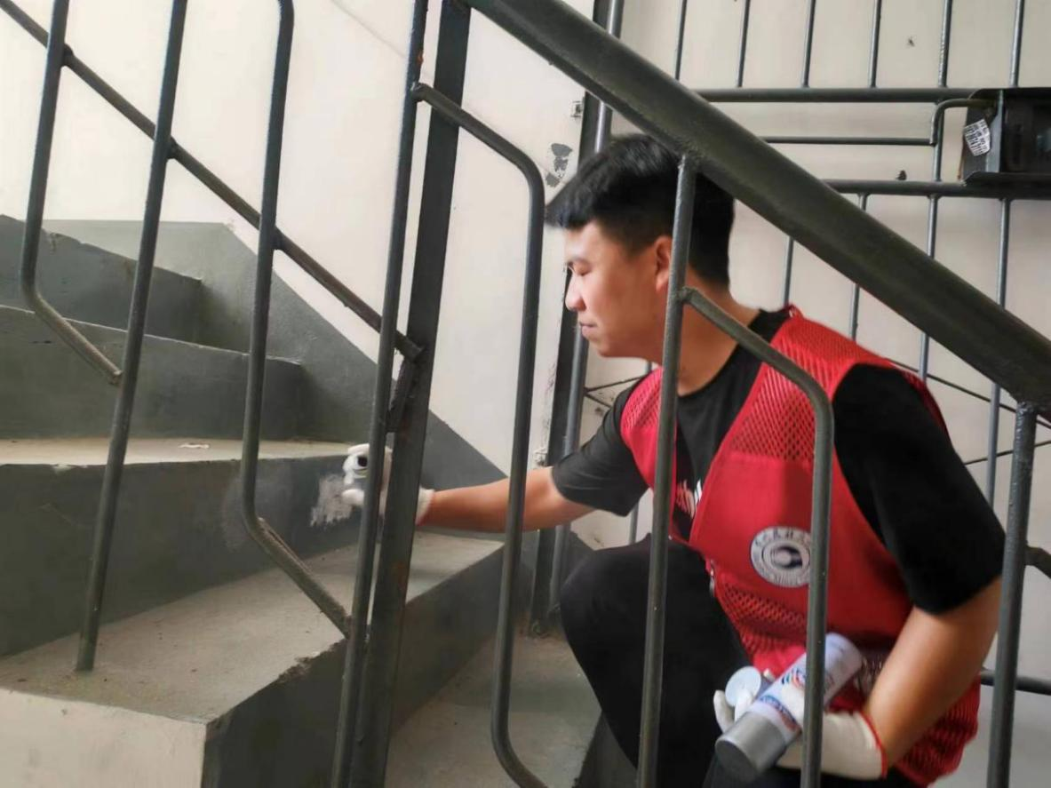 完成河道垃圾清理的工作后,队员们来到社区居民楼,对楼前屋后、楼道内等重点区域张贴喷涂的“野广告”进行全面清理,为居民营造干净整洁的居住环境。同时,对社区居民进行走访宣传,向社区青少年及家长宣传环保卫生意识,并发放防溺水安全知识宣传单,提高居民对安全卫生和防溺水工作的重视程度。