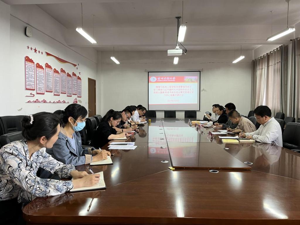 物理与机电学院在学院会议室召开学院党委暨领导班子学习贯彻习近平新时代中国特色社会主义思想主题教育读书班总结会暨党委理论学习中心组集中研讨会。会议由学院党委书记王燕妮主持,学校第六指导组组长到会指导,院领导班子成员、跟班学习干部、支部书记、组织员、科室负责人、党员代表参加。
