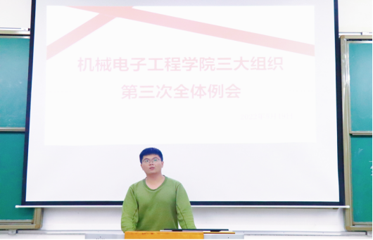温暖的春天已经渐渐离我们远去,汗水也在明媚的阳光下出现在我们的额头。经过日夜的奋斗,在临近期末之际,机械电子工程学院三大组织于5月19日晚19:00在教一负107开展本学期第三次全体例会。出席本次例会的有机械电子工程学院团委负责人赵洪,学生会主席团成员潘秋红、张游、唐彬,分团委副书记石正发、青年志愿者协会会长黄松、副会长吴正杰以及三大组织所有成员,本次例会由赵洪主持。