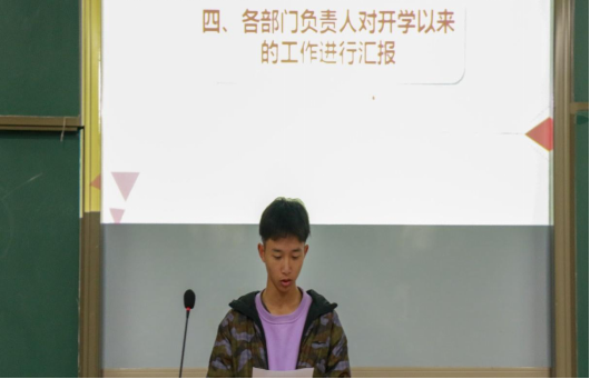 随后,三大组织各部门负责人依次对开学以来自己部门所做工作进行汇报,在肯定部员的同时也指出了存在的不足之处,希望各部门成员在以后的工作中能够端正工作态度、积极配合学院的工作、努力加强业务能力、加强思想政治的建设的殷切期望。