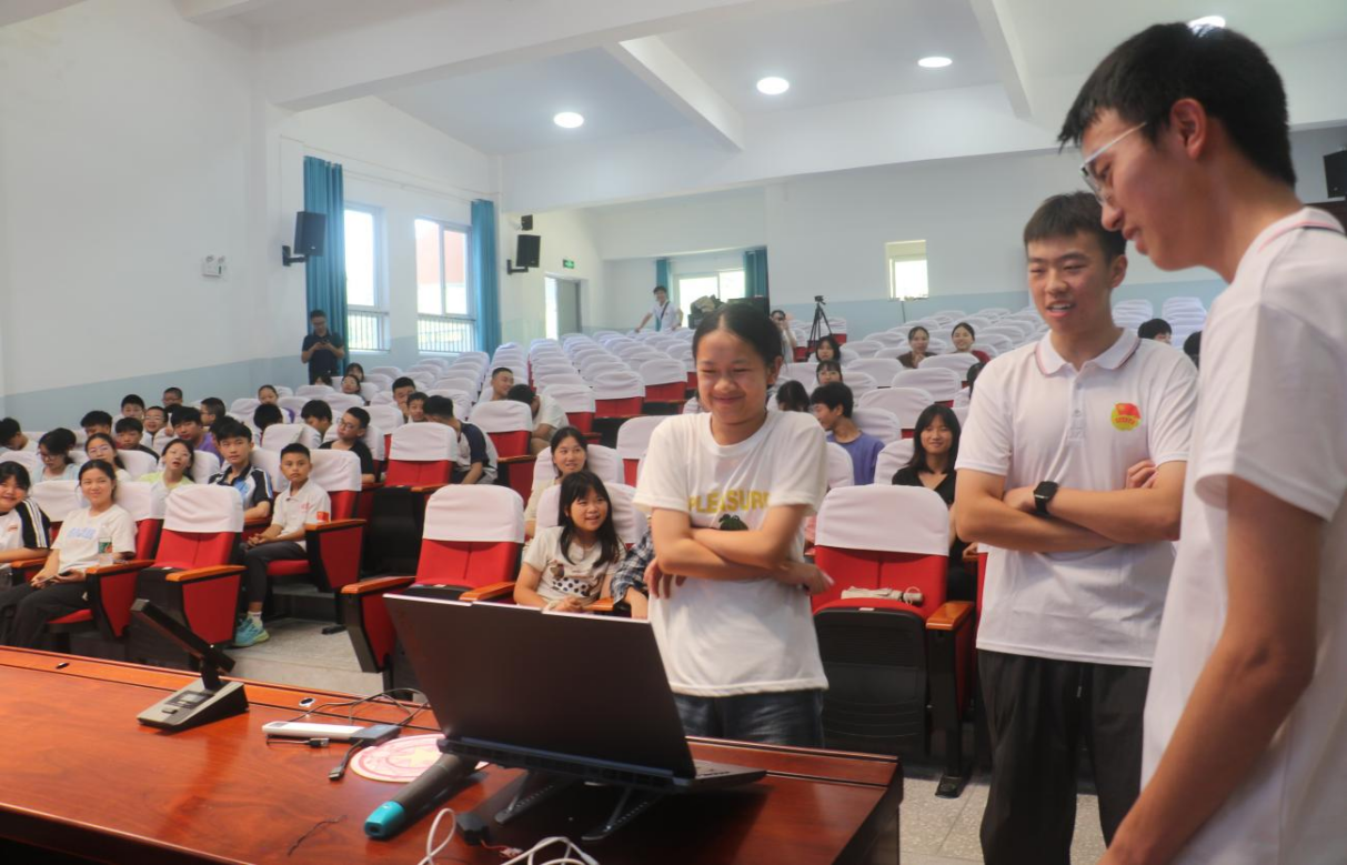 活动次日(7月15日)气氛热烈。成员龙国梅首先带来思想启迪课,引导学子们学习关于科技创新和青年成长的指示精神,鼓励他们将个人理想融入国家发展。在学科竞赛经验分享环节,吴广成展示的“表情识别”编程作品,引得初一学生好奇尝试,赢得阵阵掌声。